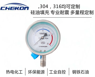 不銹鋼壓力表采用直接接觸式接頭和感壓元件材料,采用icr18Ni9T、Ocr18Ni12Mo2Ti、 sus316,結(jié)構(gòu)為全密封型,具有較強的防被測介質(zhì)腐蝕和抗環(huán)境腐蝕的能力。不銹鋼壓力表適用于腐蝕性較強的適合不銹鋼元件檢測的介質(zhì)和惡劣的外部腐蝕環(huán)境中 ,不銹鋼壓力表廣泛應(yīng)用于石油、化工、冶金等工業(yè)。