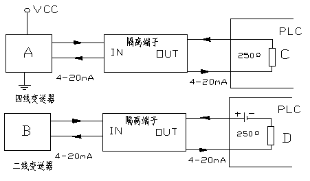 B:二線(xiàn)制變送器,它需要隔離端子供電。
