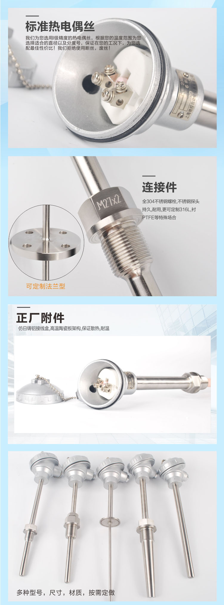 根據(jù)國家規(guī)定,我公司生產(chǎn)符合IEC國際標準分度號的鉑銠 30-鉑銠6、鉑銠10-鉑、鎳鉻-鎳硅、鎳鉻-康銅等等的裝配式熱電偶。